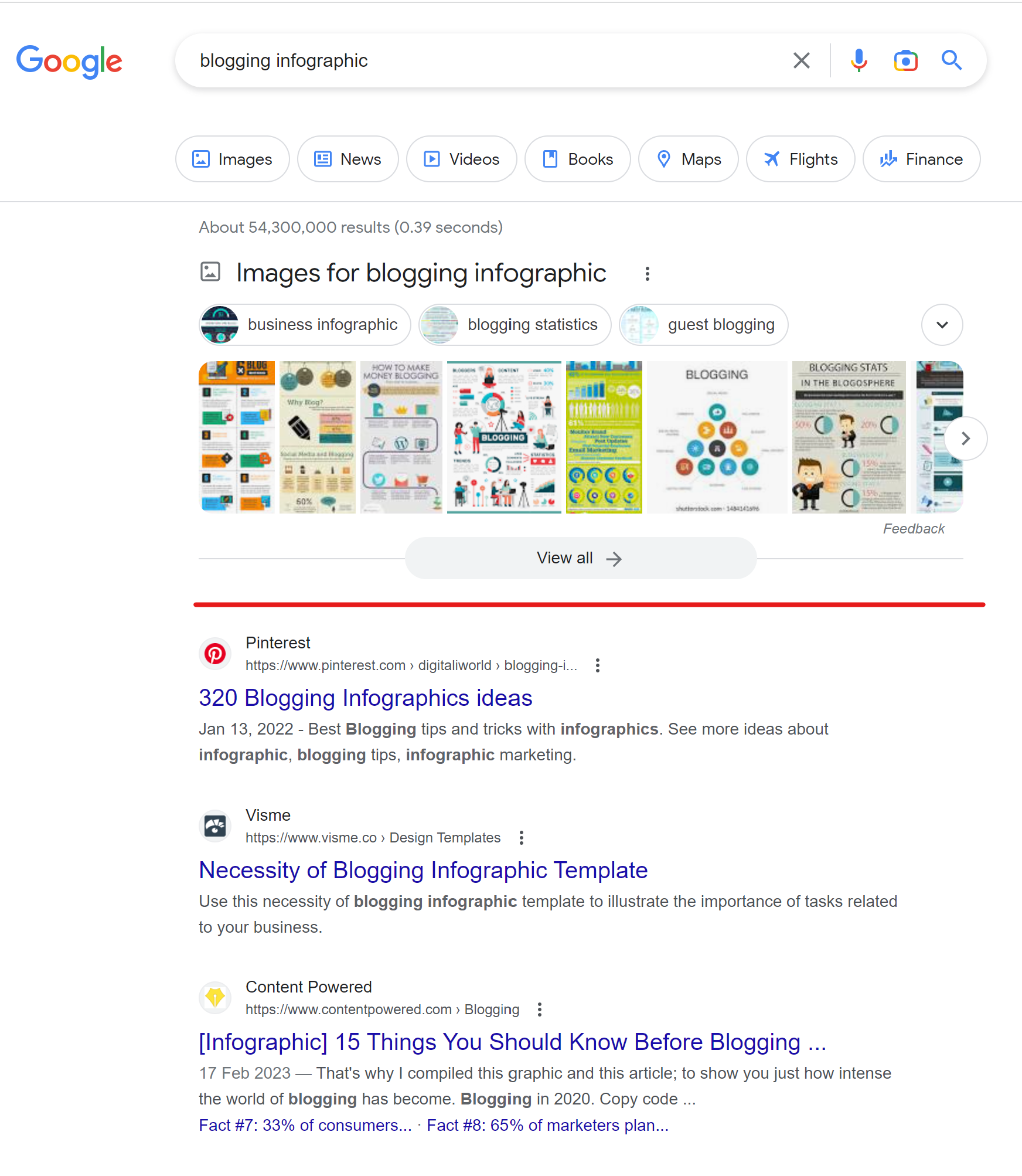 Fig 5. Searching “blogging infographic” brought up image searches first. It makes sense to create an image (the same media type as posted first) when using this search term in your blog.